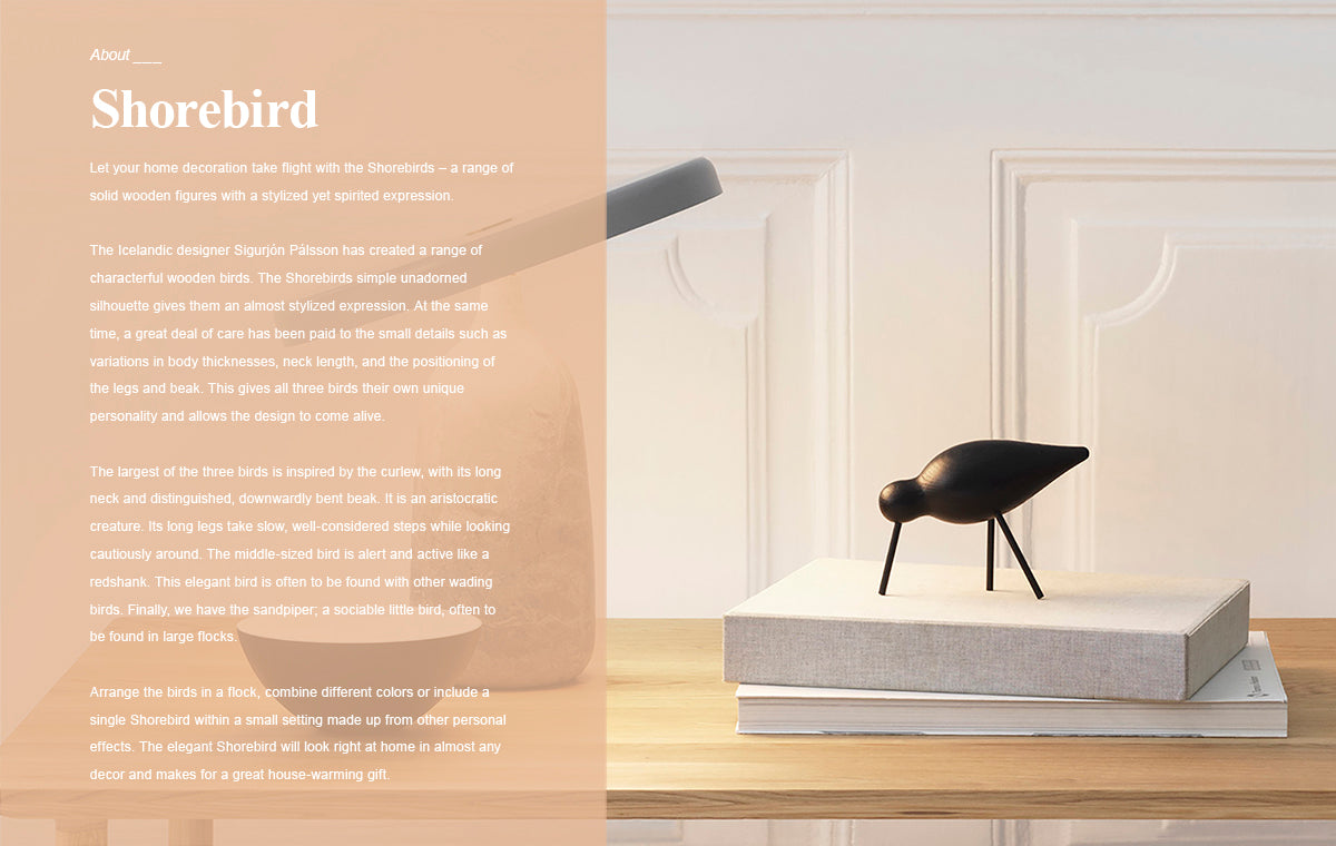 Elevate your space with the Normann Copenhagen Shorebird, a beautifully crafted wooden bird figurine designed by Sigurjón Pálsson. Inspired by nature, this minimalist home accessory embodies the elegance of Scandinavian wooden decor, making it a timeless addition to any interior.